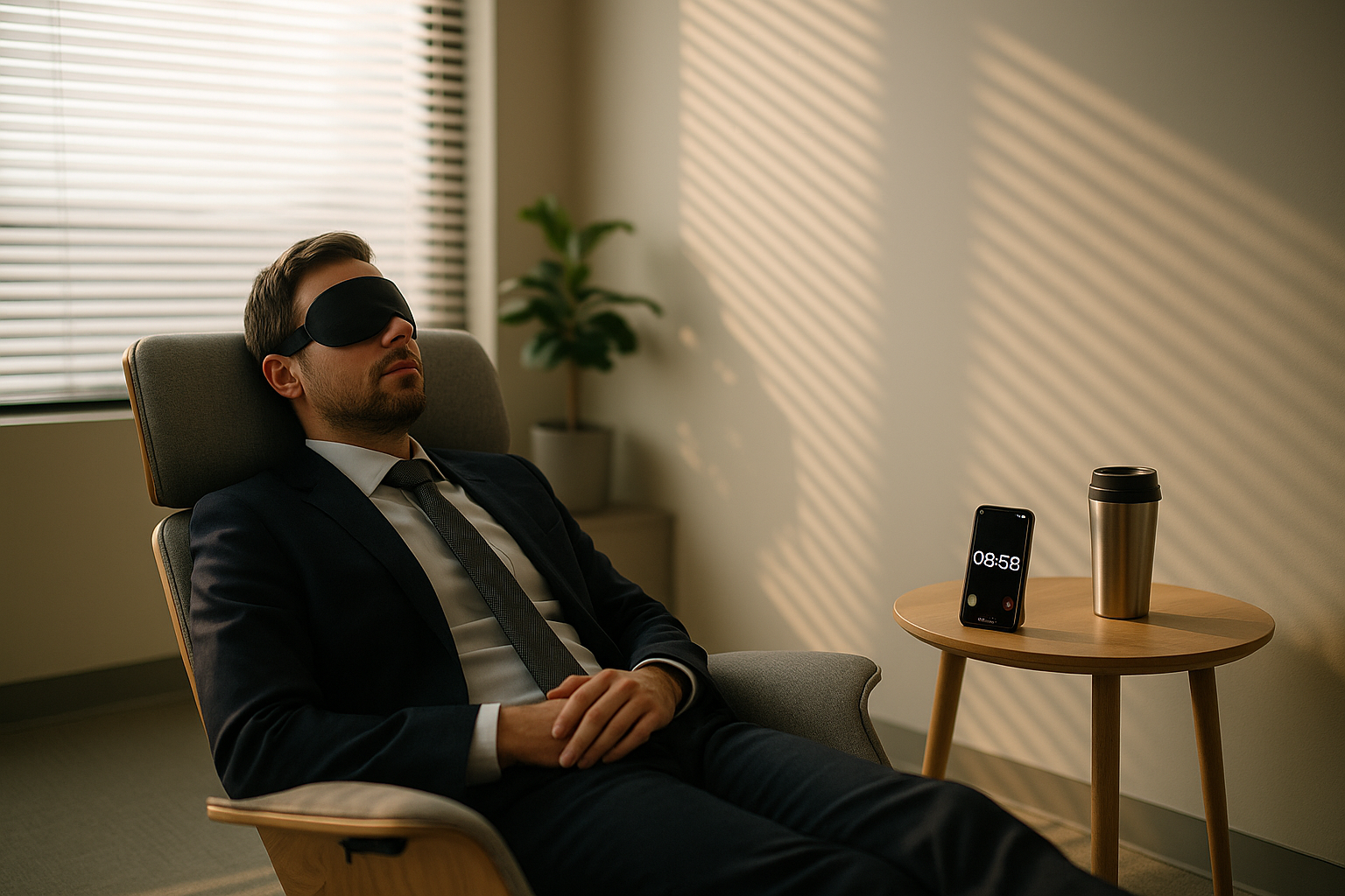The best nap spot is the one you can actually use today. A wellness or “mother’s room” is ideal: quiet, dimmable, with a recliner. If not, a parked car (seat reclined, sunshade up, windows cracked, doors locked) can be surprisingly effective. In open offices, a 45–60° chair recline with an eye mask and noise control works in a pinch. Avoid places where you’ll be interrupted (near printers, entrances). For flights, use a window seat with neck support and mask noise with in-ear buds or over-ear headphones.