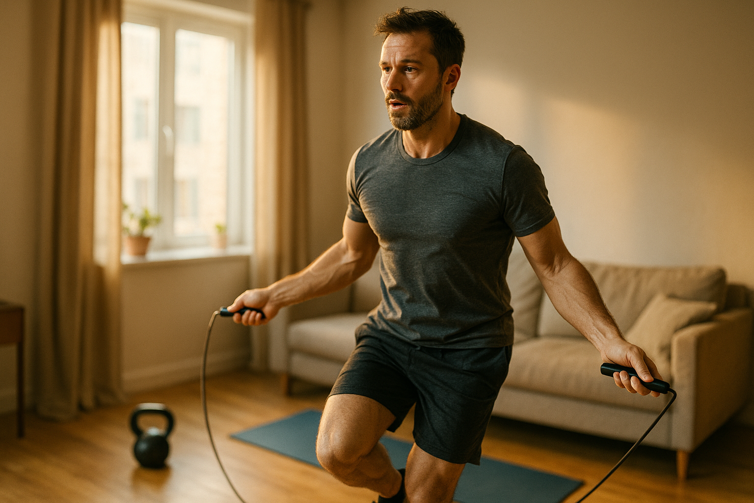 A rope turns any patch of floor into a conditioning lab. This format alternates jump rope bursts with short bodyweight efforts to tap elastic energy and move heart rate fast. It’s travel-proof, neighbors-friendly if you pick soft landings, and brutally scalable by changing foot patterns. Keep jumps quiet (think “whisper landings”), elbows near ribs, and relaxed shoulders to avoid forearm burn. If you trip, smile, reset, and keep going; consistency beats heroics.