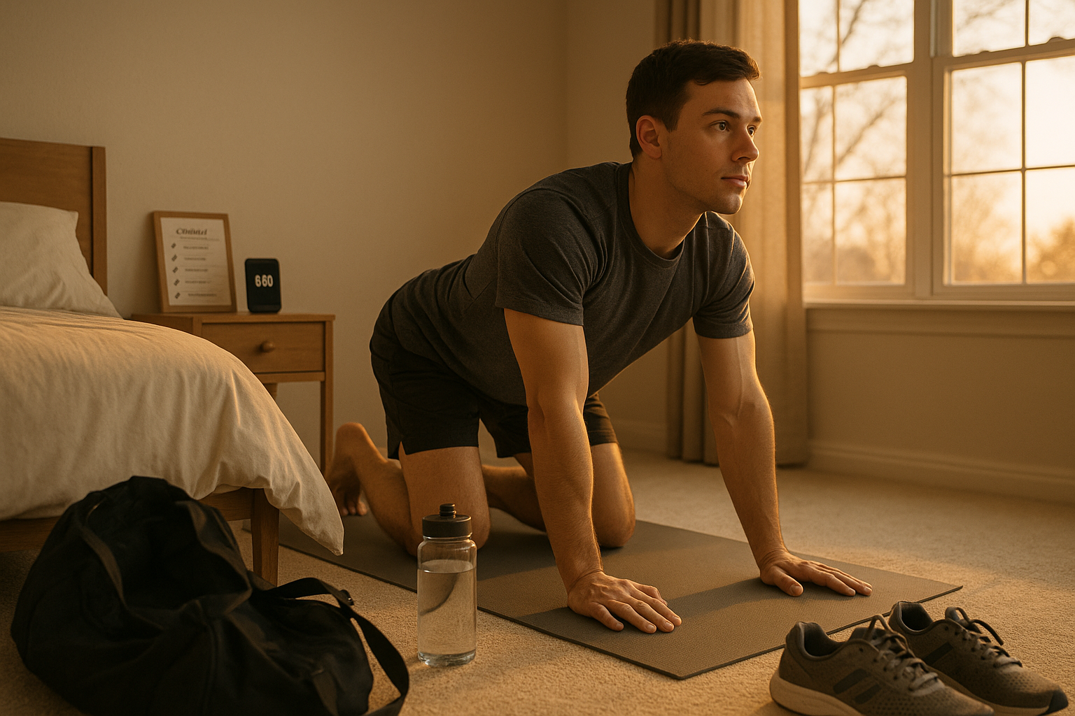 Keep a micro-kit: mini-band, jump rope, and a notebook. Fall back to 10–20-minute sessions: 5-minute RAMP, 10 minutes alternating squats/push-ups/rows, 5 minutes brisk walking or rope. Evening prep still applies—lay everything out in your room and set a calendar alert.