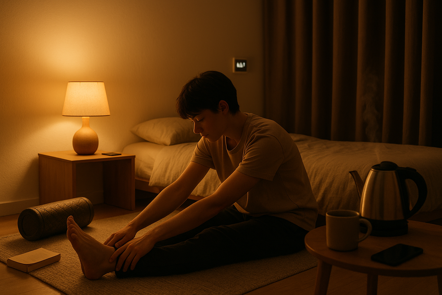 Gentle movement signals “tension off.” A short mobility sequence reduces stiffness from the day, improves range of motion, and lowers perceived muscle soreness—without raising core temperature too close to bed. Focus on hips, thoracic spine, and the posterior chain; pair slow nasal breathing with each stretch. You’re not trying to set PRs in flexibility; you’re coaxing tissues and the nervous system to relax. This is also prime time for brief self-massage with a foam roller or ball. Evidence suggests foam rolling produces small but meaningful improvements in range of motion and soreness reduction—helpful inputs for recovery when used consistently.