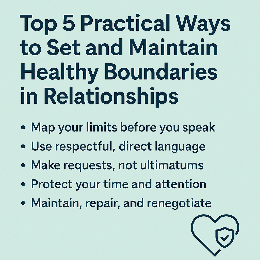 Healthy boundaries are practical acts of care—limits that honor both your well-being and the relationship you’re building. Map your limits, speak clearly, make requests first, protect your time, and maintain/repair together. Start small. Stay kind. Be consistent. Your future self—and your relationships—will thank you.
