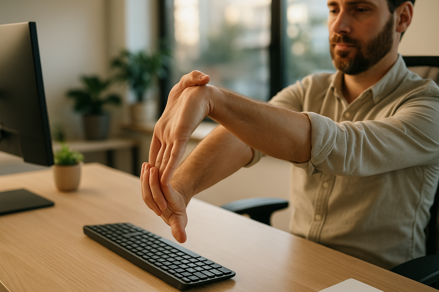 Many feel relief the same day from microbreaks and gentle stretches; strength benefits build over 2–6 weeks. If you don’t improve after 2–3 weeks—or symptoms worsen—speak with a clinician to rule out conditions like carpal tunnel syndrome or tendinopathy.